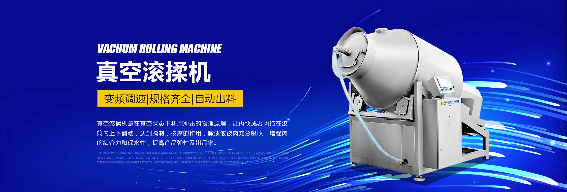 公司主要生產(chǎn)不銹鋼制品食品機械:各種規(guī)格型號真空滾揉機、制冷滾揉機、提升機、電加熱夾層鍋、肉丸機、真空攪拌機、絞肉機、灌腸機、打卡機、線扎機、斬拌機、鹽水注射機、煙熏爐、油炸機、巴氏殺菌線、連續(xù)油炸線、肉丸成型水煮線、醬鹵生產(chǎn)線、肉丸破碎機、真空包裝機、洗袋風(fēng)干機、豬頭劈半機、不銹鋼火腿模具、肉斗車、案桌、煙熏車、屠宰類機械設(shè)備、清洗風(fēng)干設(shè)備、肉類解凍設(shè)備、滾筒拌料機等。產(chǎn)品廣泛適用于火腿腸、肉丸、肉串、鹵制品、海產(chǎn)品、禽類深加工、油炸、泡椒風(fēng)味、速凍水餃、魚豆腐、千葉豆腐、豆腐干、牛肉干、牛排雞排類、禽蛋、麻辣、休閑、水果蔬菜清洗、中央廚房、餐飲連鎖、寵物食品等食品生產(chǎn)。